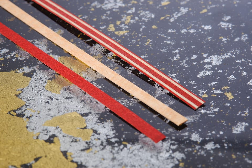 両子持縞は、寄木部材を45度のたがい違いに3回貼り付けによって作成します。