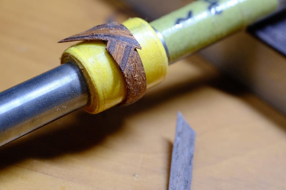 先ほど45度に切り落とした外巻き材の残りを利用して巻き終える事で色味や木理に整合性を持たせています。