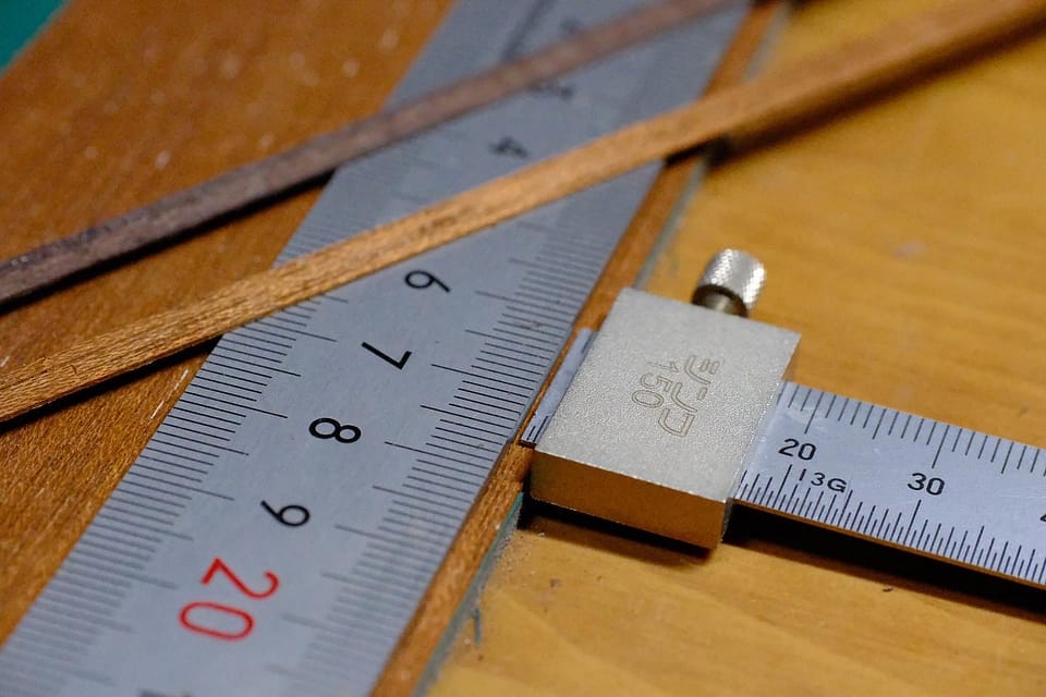 シンワ製のルーラー付きスケールを使って材料を切り分けていきます。