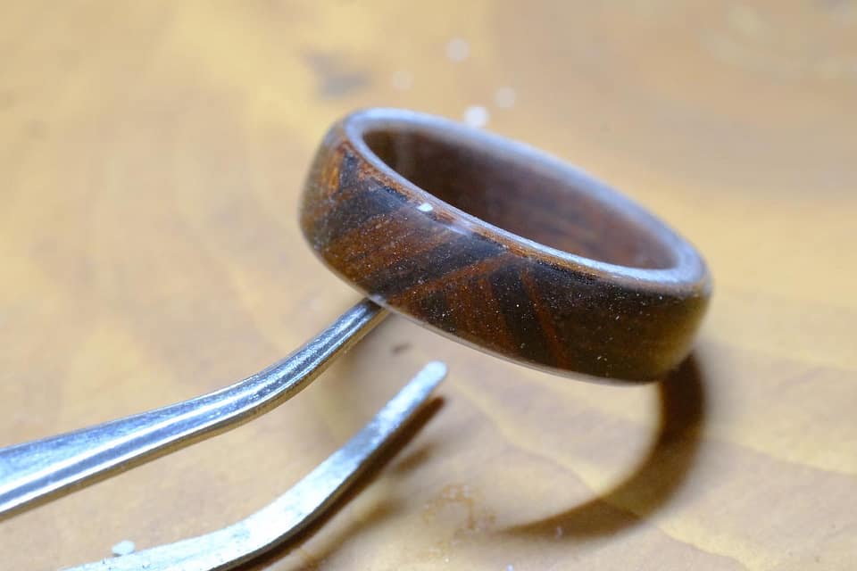 指輪の表面になる方を作業台に押し当てながら接着することで表面の段差を無くします。