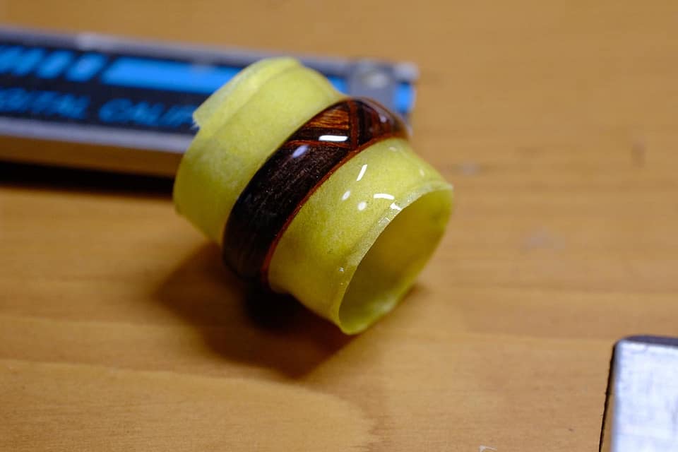 指輪の内側にぴったりと沿わせるようにマスキングテープを一周させ、表側にレジンを塗り重ねます。