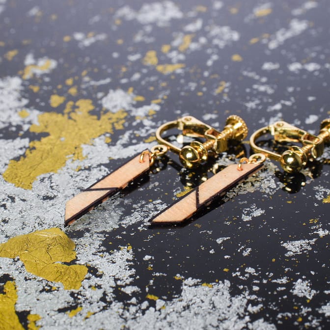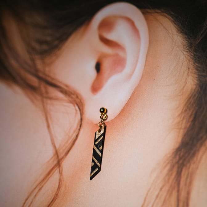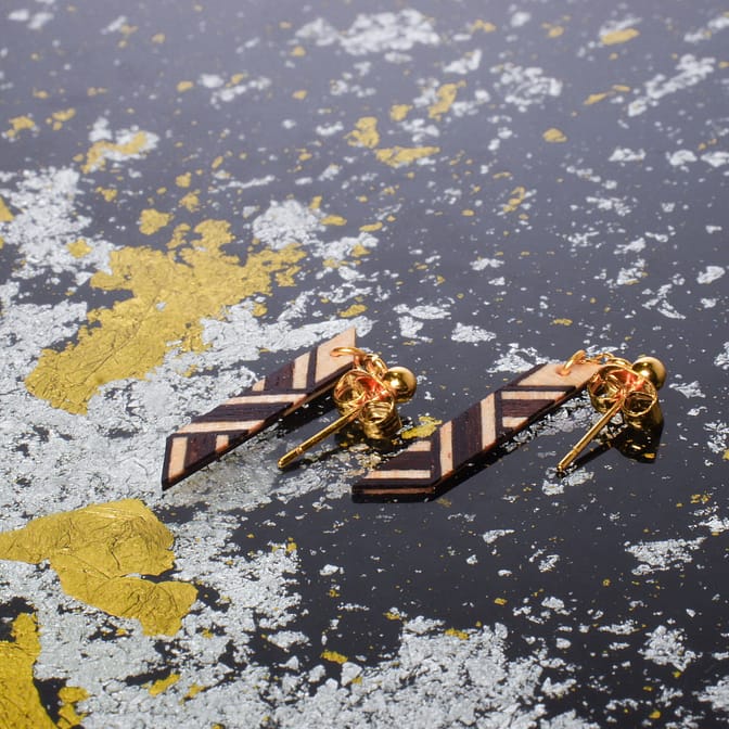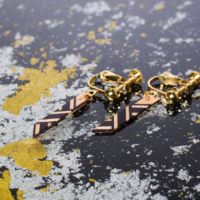 kigokoro.の主力である寄木の指輪シリーズを製作した際の端材(余り)を使用して、指輪のデザインを耳飾りに落とし込んで製作しました。