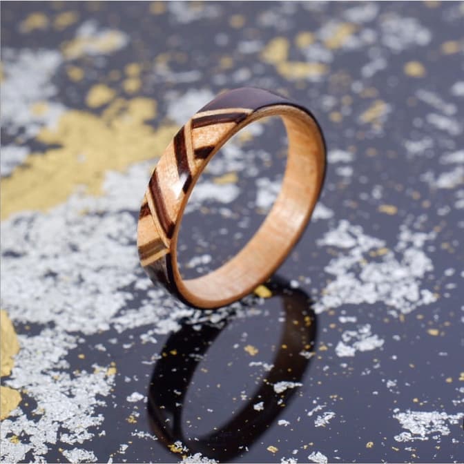 「突板」と呼ばれる厚さ0.2~0.5mmほどの木材を丸めて重ねたベントウッドリングと呼ばれる指輪です。