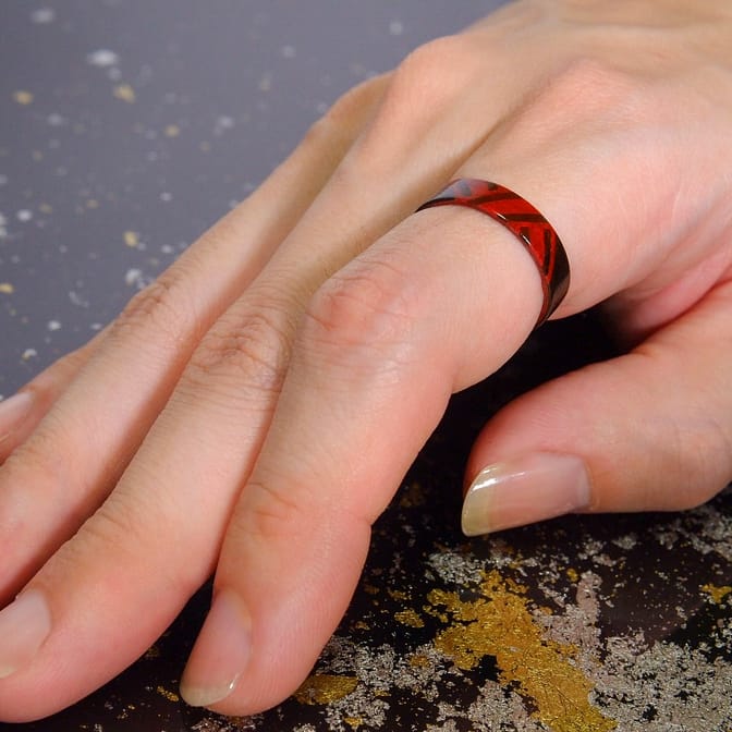 「突板」と呼ばれる厚さ0.2~0.5mmほどの木材を丸めて重ねたベントウッドリングと呼ばれる指輪です。