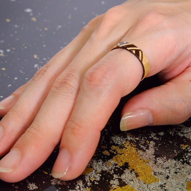 「突板」と呼ばれる厚さ0.2~0.5mmほどの木材を丸めて重ねたベントウッドリングと呼ばれる指輪です。