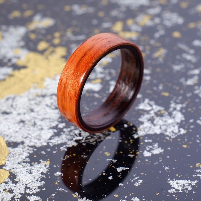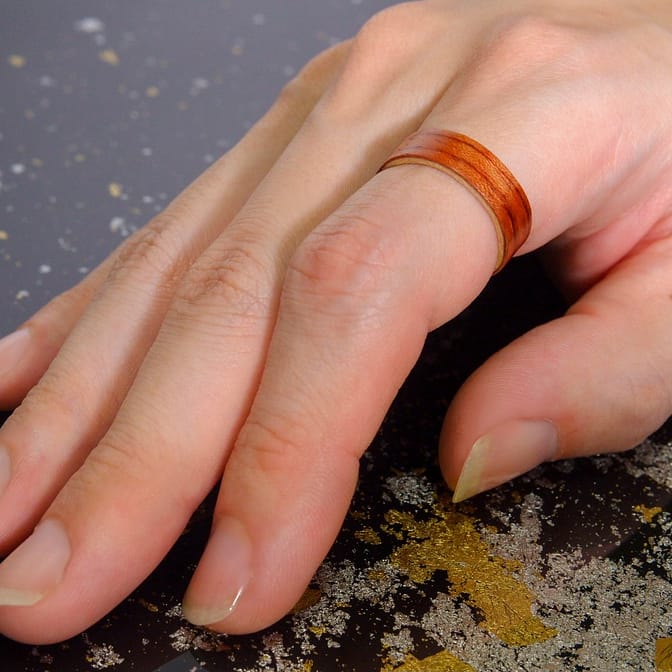 「突板」と呼ばれる厚さ0.2~0.5mmほどの木材を丸めて重ねたベントウッドリングと呼ばれる指輪です。